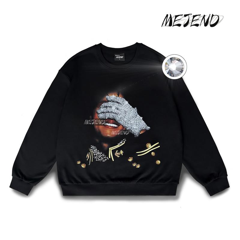 Unisex 100% Cotton Long Sleeve Sweatshirt, Sparkly Rhinestone Graphic Top, Oversized Streetwear Pullover, Casual Outfit
